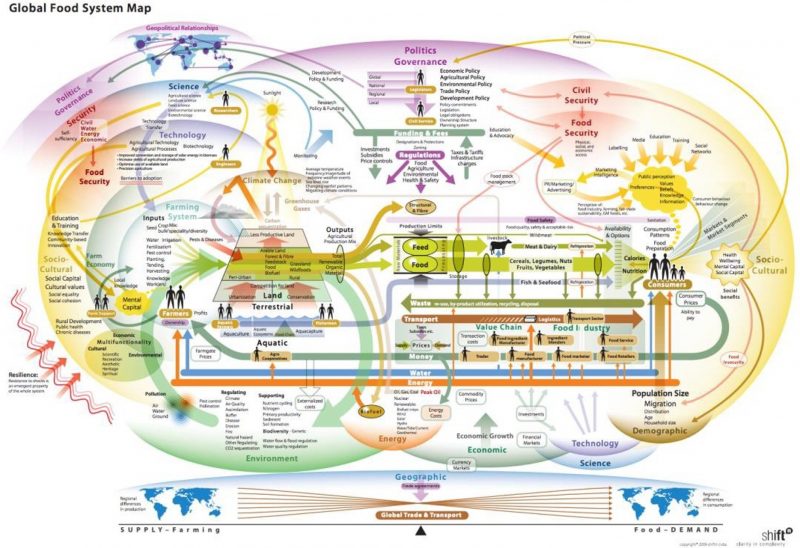 One specific context that allows science education for sustainability to come alive in the classroom is the complexities of our global food systems as shown in the figure below. This intricate web of agriculture and food production involves multiple scientific disciplines like biology, chemistry, agronomy, ecology, genetics, food science, and environmental science. By exploring these connections, students gain insight into how various scientific fields collaborate to address real-world challenges.