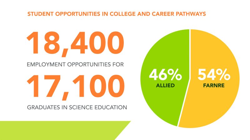 There are many opportunities for students to make a positive impact through college and career pathways. According to data from the National Institute of Food and Agriculture (NIFA) and presented by Purdue University, between 2020 and 2025 in the United States, there will be an average of 18,400 annual job openings for new college graduates in Science and Engineering, specifically emphasizing food, agriculture, renewable natural resources, and the environment (FARNRA). Additionally, during the same period, 17,100 graduates with degrees and expertise in science and engineering will enter the food, agriculture, renewable natural resources, and environment workforce. This cluster includes occupations related to the production, transportation, processing, and distribution of food and fiber, as well as those focusing on the interface of food science, human nutrition, and health. Approximately 31% of all available positions in food, agriculture, renewable natural resources, and the environment fall under the Science and Engineering category. Among these openings, 54% (9,200) will be filled by graduates with degrees from institutions offering academic majors and degrees in the field, while the remaining 46% (7,900) will be filled by graduates from allied fields of study (Science and Engineering, 2020-2025).
